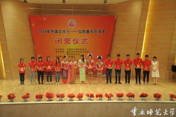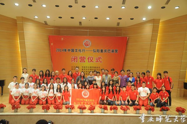 近日,由中国华文教育基金会主办,重庆市外事侨务办公室与我校共同承办、弘阳集团资助的2014年中国文化行——弘阳重庆巴渝营闭营仪式在我校校友会堂音乐厅举行。校领导周晓风、重庆市外事侨务办公室新闻文化处副处长王燕等领导出席。闭营仪式由我校华文教育基地办公室副主任王晓敏主持。