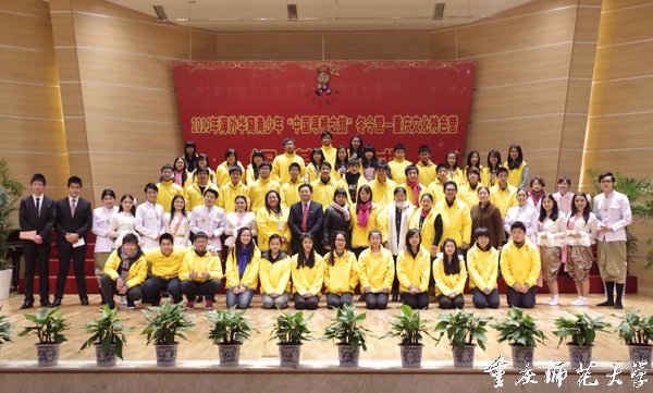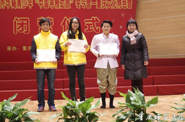 2014年1月9日下午,2013年海外华裔青少年“中国寻根之旅”冬令营—重庆文化特色营闭营式在我校大学城校区校友会堂音乐厅举行。重庆市外事侨务办公室新闻文化处、我校国际汉语文化教育管理办公室等相关部门负责人出席。来自澳大利亚、印度尼西亚和泰国的近60名冬令营领队和营员及我校各学院学生代表参加了此次活动。活动由国际汉语文化教育管理办公室副主任王晓敏主持。