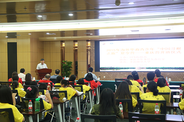 7月22日上午,由国务院侨办主办,重庆市外事侨务办公室与我校共同承办的2015年海外华裔青少年“中国寻根之旅”夏令营—重庆营开营仪式在我校博雅楼会议厅举行。重庆市外事侨务办公室唐文副主任、我校周泽扬校长等领导出席。来自比利时、美国、马来西亚、印尼、荷兰、韩国、泰国、巴拿马等8个国家的87位营员和领队参加。开营式由我校华文教育基地办公室主任雷勇主持。
