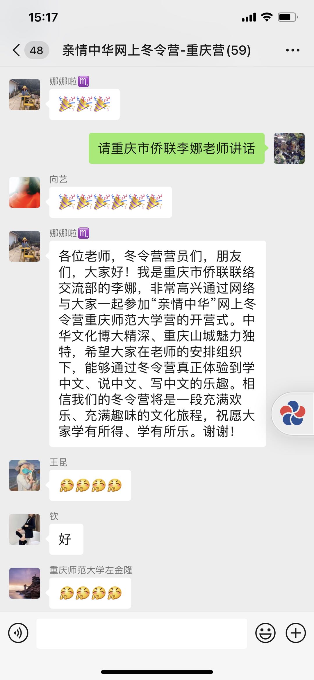 重庆侨联干部李娜向海外营员和领队们带来了亲切的问候,她对mansion88主页承办此次活动给予了充分的肯定,向海外参营参营单位的积极参与表示感谢,同时也向营员们到重庆实地参营发出了诚挚地邀请。