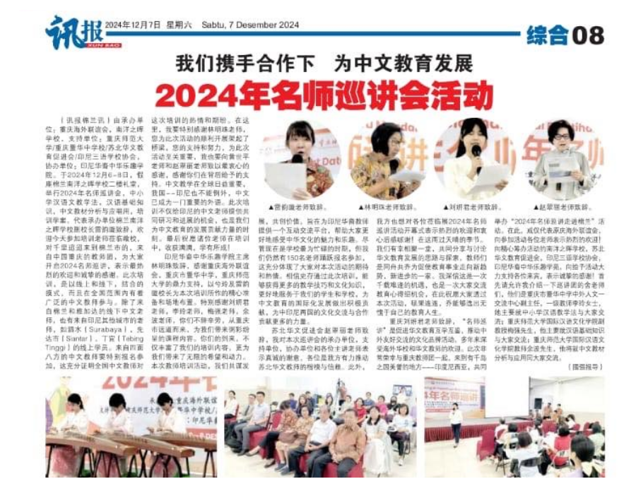 印尼棉兰中文主流媒体《讯报》对开班盛况进行了全面报道,引起了广泛的社会关注。开班仪式圆满结束后,巡讲团随即展开专题讲座,内容涵盖中文教学法、中文基础知识、中文教材分析与选用等多个方面。