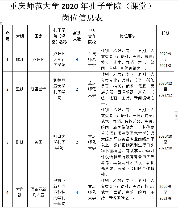 我校学生仅限报考我校海外孔子学院和柬埔寨志愿者。(我校本次海外招募孔子学院有:卢旺达大学孔子学院、斯里兰卡凯拉尼亚大学孔子学院、英国知山大学孔子学院、巴布亚新几内亚科技大学孔子学院。具体要求详见附件)