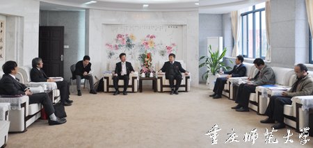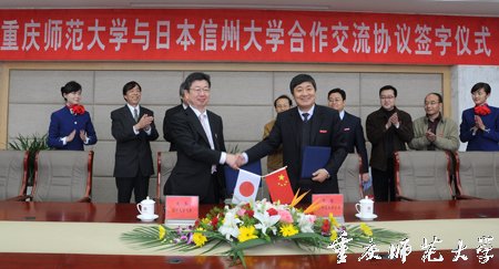 会谈中,周校长首先代表学校对下坂诚教授一行来我校交流访问表示热烈欢迎,并介绍了学校办学历程特别是近年来学校改革与发展情况,希望我校与日本国立信州大学进一步加强交流与合作。下坂诚教授代表信州大学对学校领导的会见表示感谢,对我校美丽的校园建设给予了高度赞赏,并介绍了代表团此行的主要目的。在坦诚、热烈的气氛下,宾主双方就教师交流互访、学生互派、教师合作科研、共同举办学术会议等问题交换了意见,对将来拓宽合作领域进行了深入的探讨。周校长指出,前不久由日本国际交流基金会支持成立、落户我校的“重庆中日交流之窗”,作为我校与日本有关机构的合作成果,在学习语言、文化交流等方面起到了显著作用,希望具有国际影响力的日本国立信州大学不仅在与我校的文化交流合作中发挥积极作用,而且在促进汉语国际推广方面取得新成果。随后,双方代表在309会议室签署了两校合作交流框架性协议以及合作科研与互派留学生项目的两个具体协议。