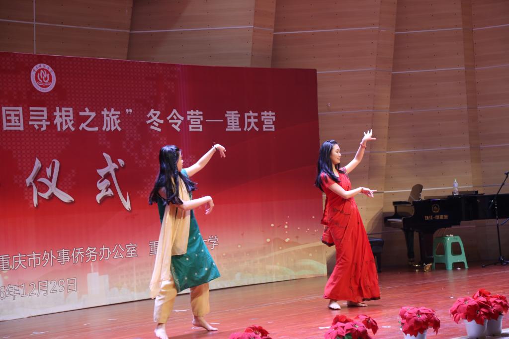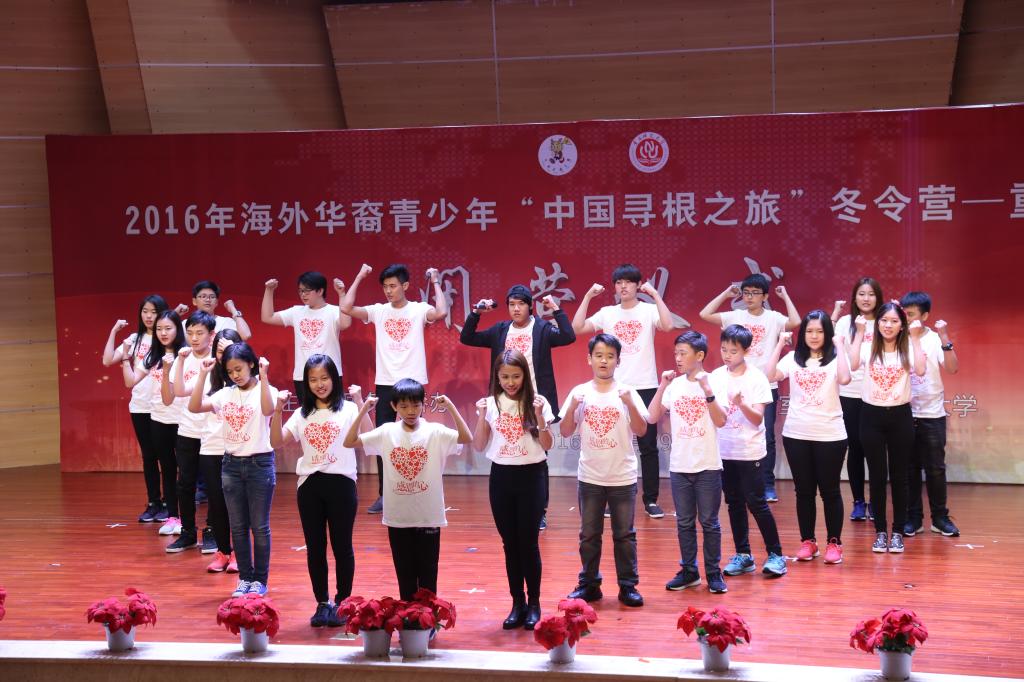 闭营仪式之后,中外学生一起表演了丰富多彩的节目,冬令营营员汇报表演了参营期间学习的书法、剪纸、版画和武术。节目最后,台上台下齐唱国侨办海外华裔青少年“中国寻根之旅”项目歌曲《四海一家》,小小的五星红旗舞动全场,中外学子共祝祖国,共贺新年。