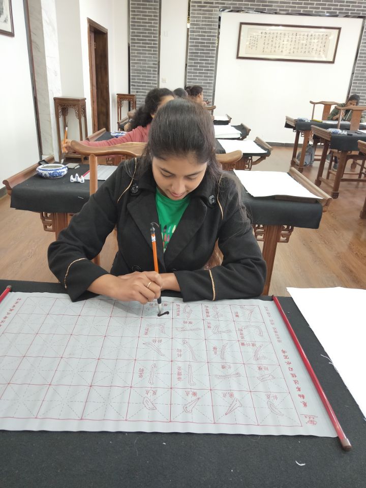 兴趣是最好的老师,本次中国文化体验课主要是留学生根据个人兴趣爱好,自主选课,每位留学生可以选择一至两门中国文化体验课。茶艺课上,学生先观看茶艺老师演示泡茶,随后在茶艺老师的指导下尝试泡茶、品茶等等。学生们在书法课上的表现亦可圈可点,书法老师在讲解握笔的姿势以及汉字笔画时,学生全神贯注地听讲,被这不一样的汉字书写方式所吸引。剪纸课上,同学们在剪纸老师的指导下,纷纷拿起剪纸工具在红纸上剪裁富有中国特色的“囍”字图案,展现了他们的动手能力。
