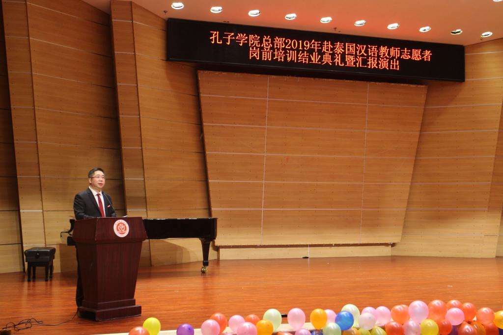 4月9日下午,“孔子学院总部2019年赴泰国汉语教师志愿者培训”结业典礼在我校校友会堂音乐厅举行。校长孟东方教授出席并致辞。结业典礼由mansion88主页雷勇院长主持。 赴泰国汉语教师志愿者全体学员和mansion88主页工作人员一起参加了典礼。