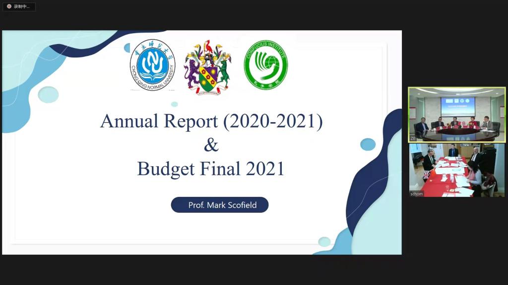 英国知山大学孔子学院外方院长马克·斯科菲尔德教授进行了2020、2021年工作总结及财务决算汇报。中方院长何加红向理事会汇报了2021年的教学工作,2022年的工作计划。