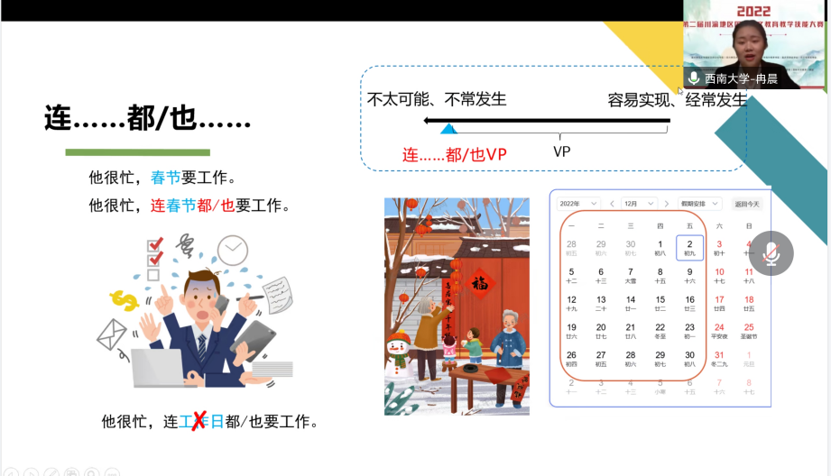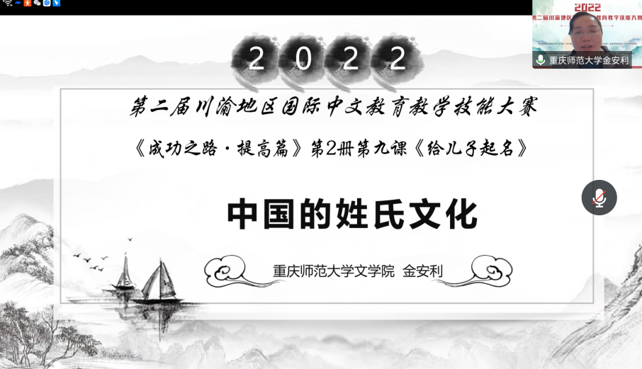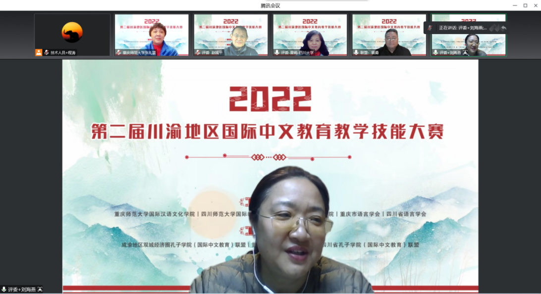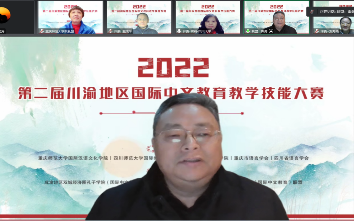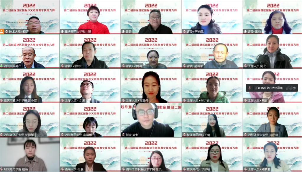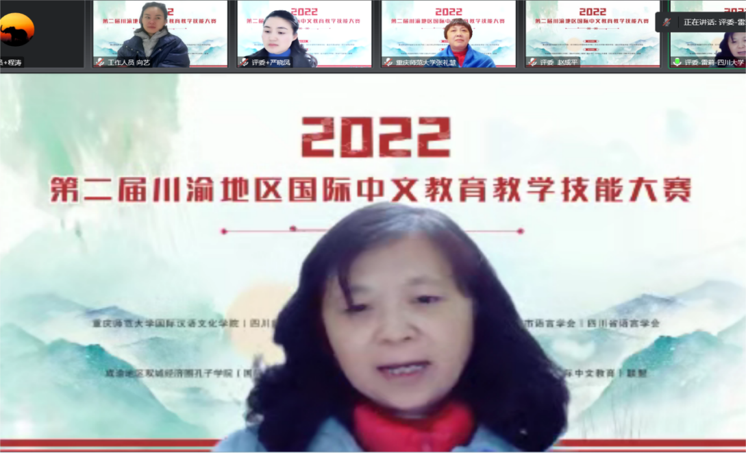 这是一场川渝地区国际中文教育领域举办的规模最大、类别最多的教师技能赛事。本次大赛依托成渝地区双城经济圈教育合作大背景,以搭建区域师资交流平台、深化区域国际中文教育合作为主旨。由于疫情,决赛采取线上授课方式,来自四川大学、西南大学、四川师范大学、mansion88主页、四川外国语大学、四川轻化工大学、长江师范学院、四川文理学院、阿坝师范学院、重庆对外经贸学院、四川信息职业技术学院、乐山职业技术学院、重庆市暨华中学校等13所院校的20名教师各展风采。