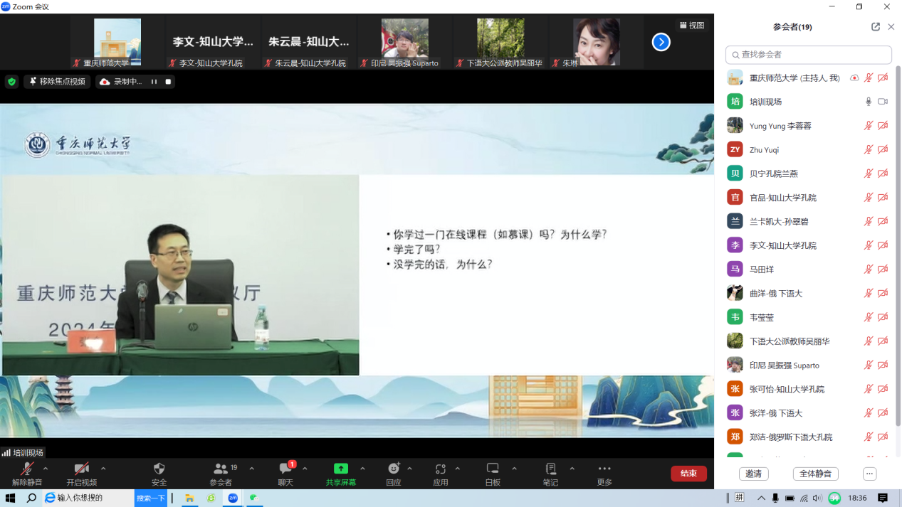 据悉,本次培训是重庆市国际化特色项目—重庆市国际中文教育功能综合体建设任务之一,由重庆市国际中文教育联盟、重庆市国际中文教育协作机制秘书处、成渝地区双城经济圈孔子学院(国际中文教育联盟)共同主办。培训邀请了北京师范大学张会教授、四川大学雷莉教授、重庆大学龙藜副教授、西南大学杨甜副教授等业内专家。受训学员在两天的培训中学习了《国际中文教育课堂教学案例分析》、《跨文化交际与国际中文教育》、《国际中文教育课堂管理》《国际中文教育线上课程设计与制作》等课程。此外,本次培训还邀请了重庆市外办涉外管理处处长杨瑜讲授涉外领事保护,杨处长为大家详细讲解了领事保护的范围与内容。