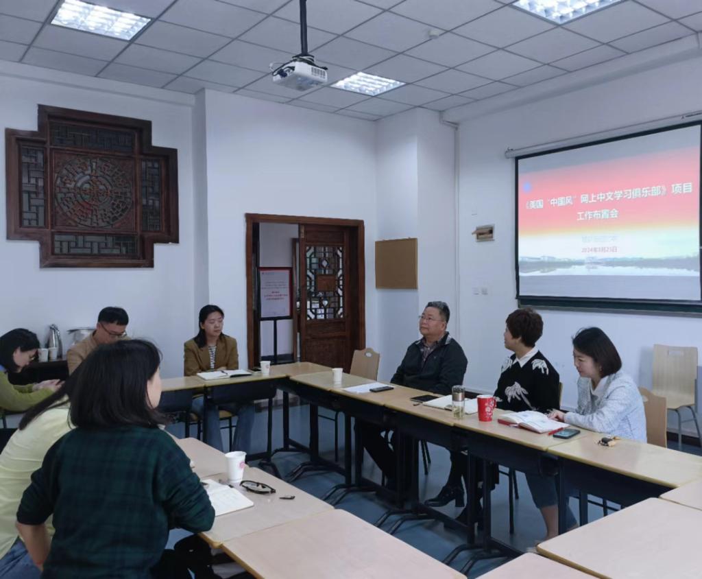 会上,张院长介绍了本次《美国“中国风”网上中文学习俱乐部》项目的背景。雷勇教授对工作内容分工、人员安排、工作要求、重要事件及时间节点等内容进行了具体讲解。《美国“中国风”网上中文学习俱乐部》项目共包含教学工作、家长座谈及研究工作三部分。