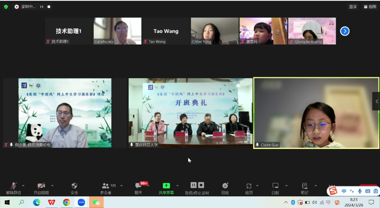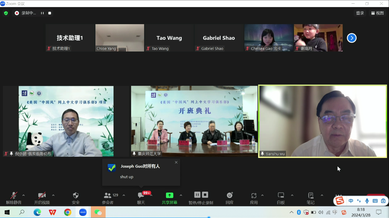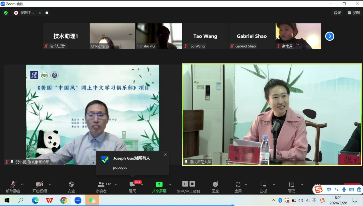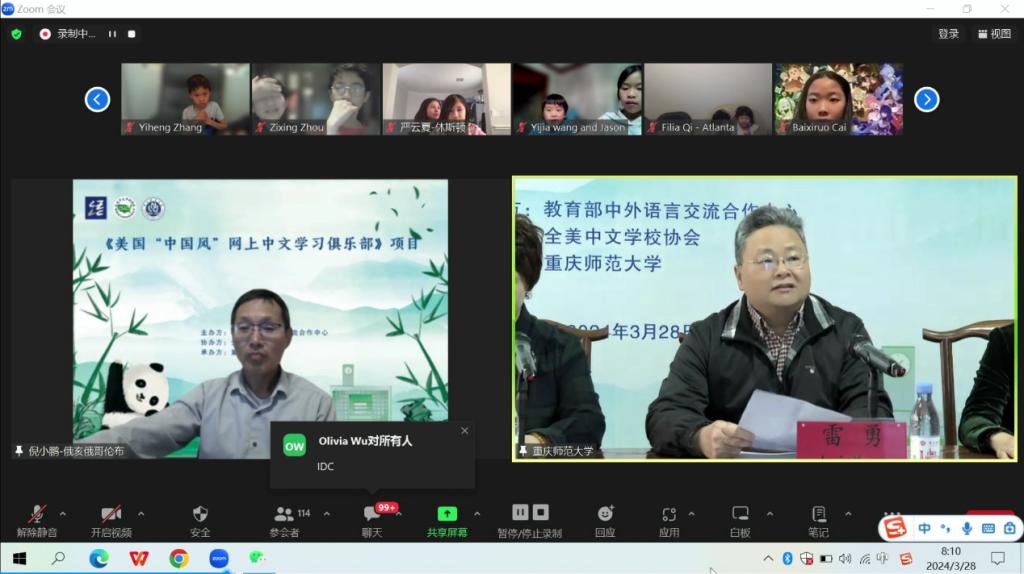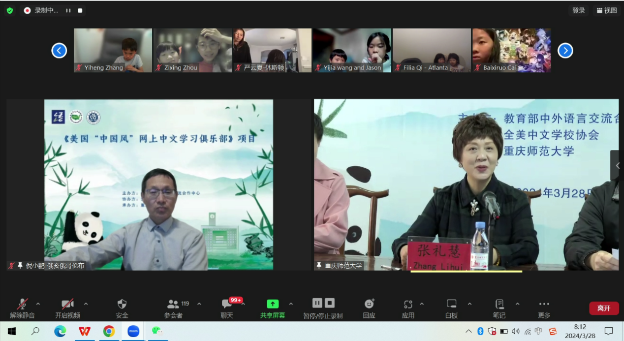 2024年3月28日,由教育部中外语言交流合作中心主办、全美中文学校协会协办、mansion88主页承办的“美国‘中国风’网上中文学习俱乐部”项目的开班典礼,在mansion88主页通过ZOOM平台线上举办;全美中文学校协会吴天舒副会长、全美中文学校协会前会长倪小鹏,mansion88主页院长张礼慧、副院长刘眉、授课教师代表穆亚伟等领导嘉宾出席,开班典礼由项目负责人-重庆市国际中文教育联盟秘书长、mansion88主页教授雷勇主持。