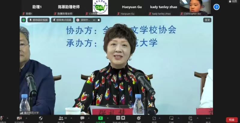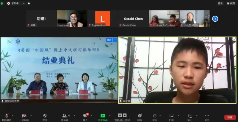 最后吴会长希望孩子们在今后对中国语言和文化的学习实践中,不断进取,勇于更深层探索中华文化博大精深。真诚希望重庆师大各级领导、专家、教授和导师们继续关注和鞭策在美华裔孩子们。同时也希望协会与重庆师大能够多多联系和分享,共同开拓海外华裔青少年学习传承中国语言与文化的新境界,共筑国际中文教育之路。