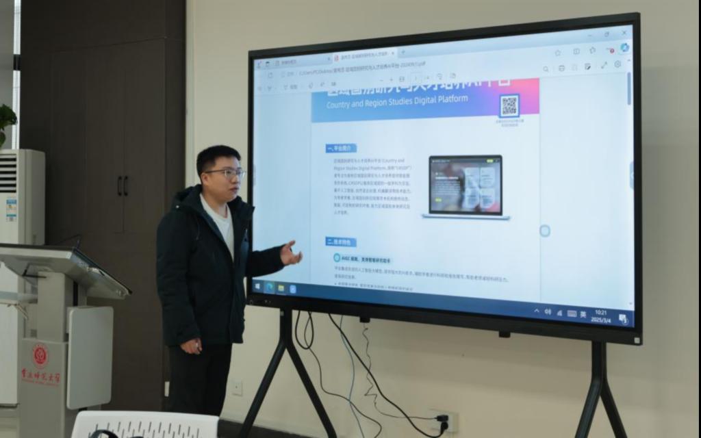 本次活动聚焦人工智能技术如何赋能区域国别学研究的创新实践与学科发展,特别邀请数字化技术专家为老师们做专题报告,深入剖析人工智能在国别研究中的前沿应用。技术专家详细介绍了数据平台的使用,教师、研究人员可利用平台数据,抓取热点新闻、汇总相关研究咨询,“亲临”不同研究对象国,高效搜集信息,获取研究素材。