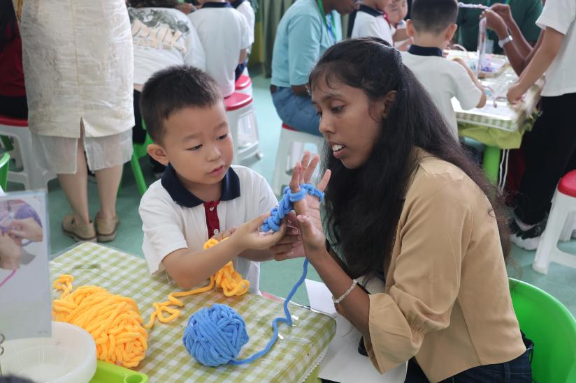 移步大学城幼儿园,杨洪梅园长对幼儿园进行了整体介绍。营员们参观并体验了孩子们丰富多彩的户外游戏活动,在划船游戏、绳网通道、积木搭建、炊具手鼓和烹饪制作等活动中深度参与,和孩子们共同游戏。户外游戏结束后,营员们还与小朋友们一起动手体验了晕染画制作、中国结编织、手指围巾和毛绒手链等手工活动,在活动中感受传统文化,学习趣味中文。
