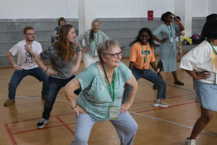 营员们在体育馆和一年级小学生共同上了一堂生动的武术课,学习中国传统武术拳法“五步拳”。在课程结束之际,体育老师还为大家展示了一段太极拳,其自然流畅的动作赢得了中外学员们的掌声。