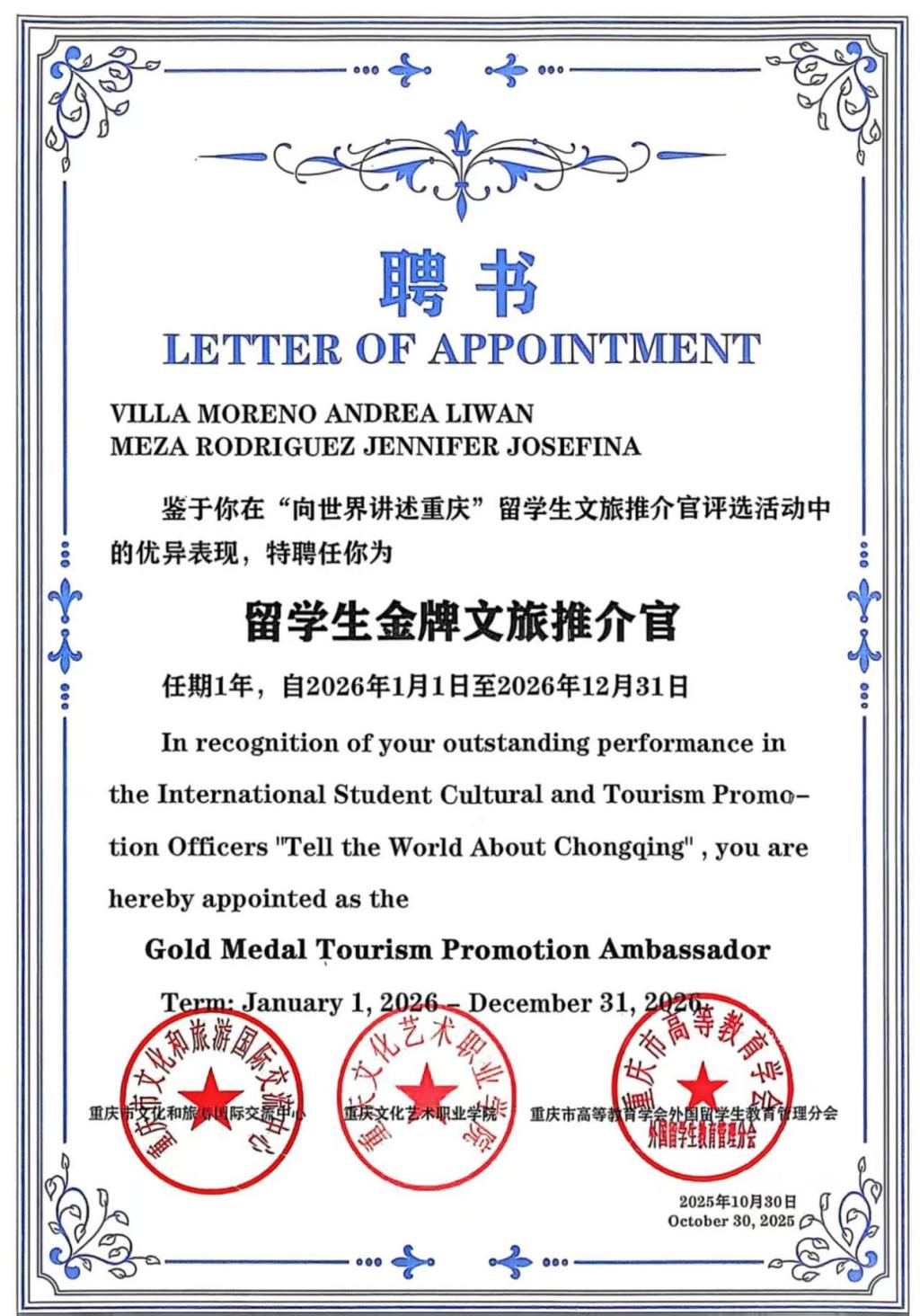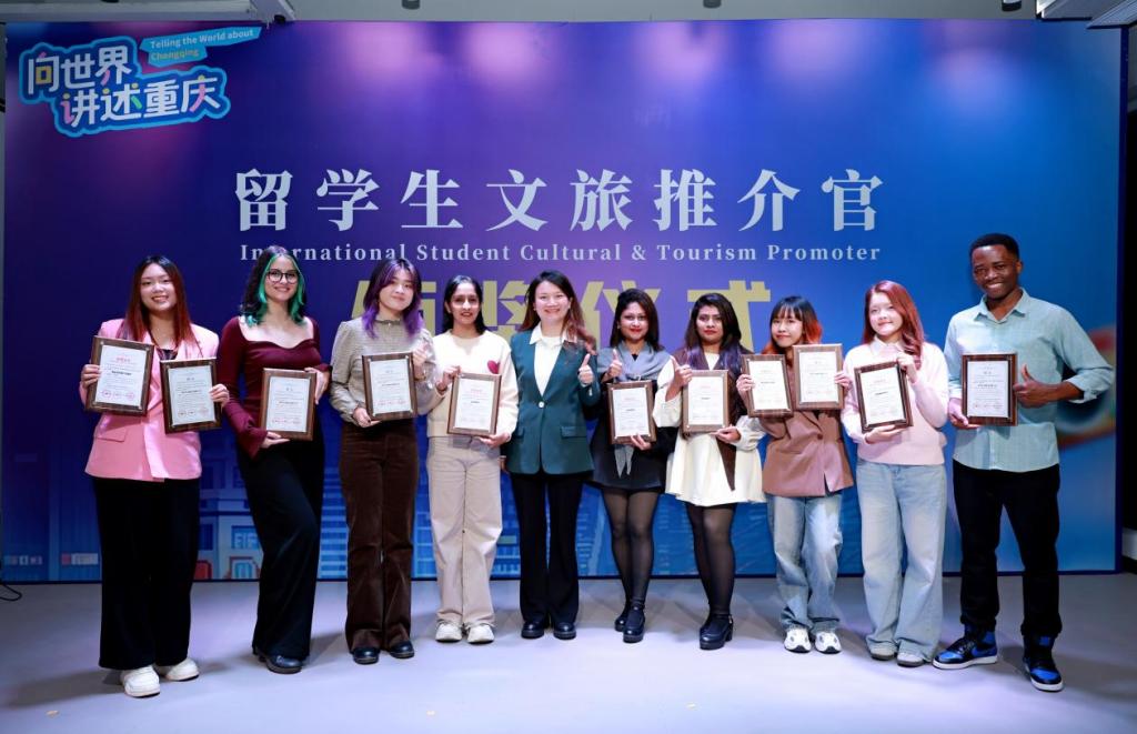 我校留学生通过短视频、vlog、图片文案等多种媒介形式,融入独特的文化视角与个人情感,在130余件参赛作品中脱颖而出,斩获3项“金牌文旅推介官”及3项单项奖。所有荣获“金牌文旅推介官”称号的留学生,将被正式授予一年聘期,自2026年1月1日至12月31日。所有获奖者均被纳入重庆市“国际人才推广库”。
