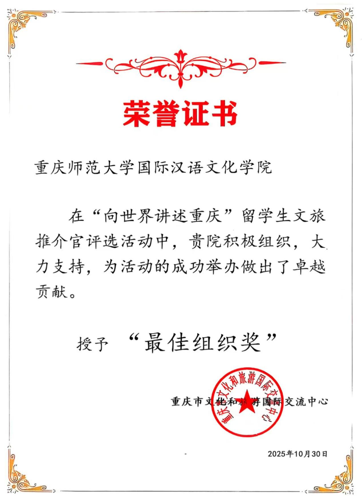 10月30日,由重庆市文化和旅游发展委员会指导,重庆市文化和旅游国际交流中心、重庆文化艺术职业学院、重庆市高等教育学会外国留学生教育管理分会联合主办的 “向世界讲述重庆”留学生文旅推介官颁奖仪式在重庆嘉陵江索道博物馆举行。我校9名留学生在颁奖活动中斩获“金牌文旅推介官”“最佳编辑奖”等6项大奖,mansion88主页荣获“最佳组织奖”。mansion88主页培养培训科科长杨畅应邀出席了本次活动。