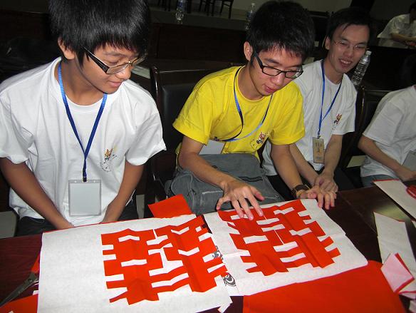 两名印尼营员比比谁的喜字剪得好