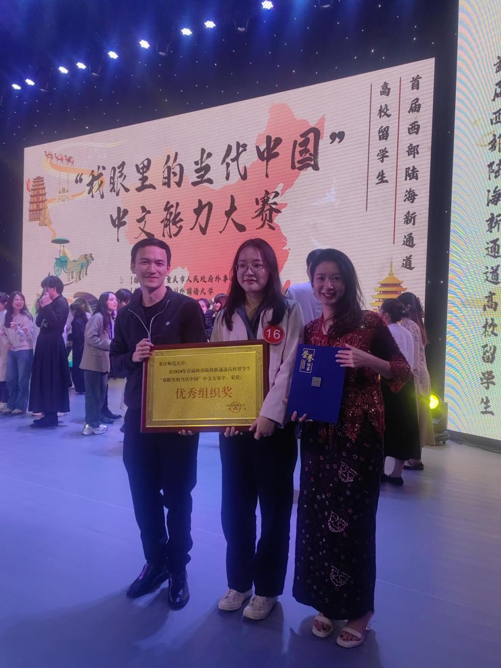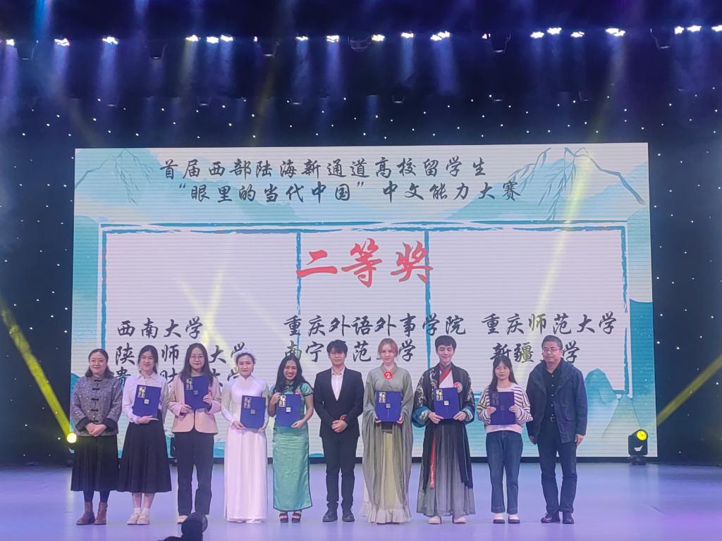 11月15至16日,首届西部陆海新通道高校留学生“我眼里的当代中国”中文能力大赛在四川外国语大学举行。mansion88主页组建中外学生代表队参赛(刘羽,中国;官珍妮,印度尼西亚;阮德清,越南),经过中文演讲、知识竞答、情景猜谜和中华才艺四个环节的比拼,最终获得“二等奖”和“优秀组织奖”,展现了我校留学生的优秀中文能力和对中国文化的深刻理解。