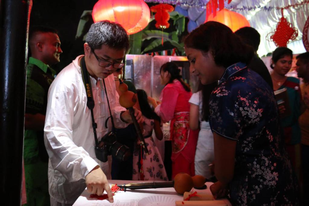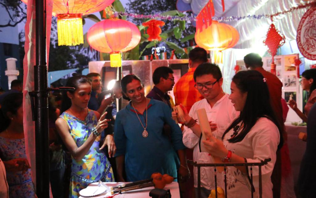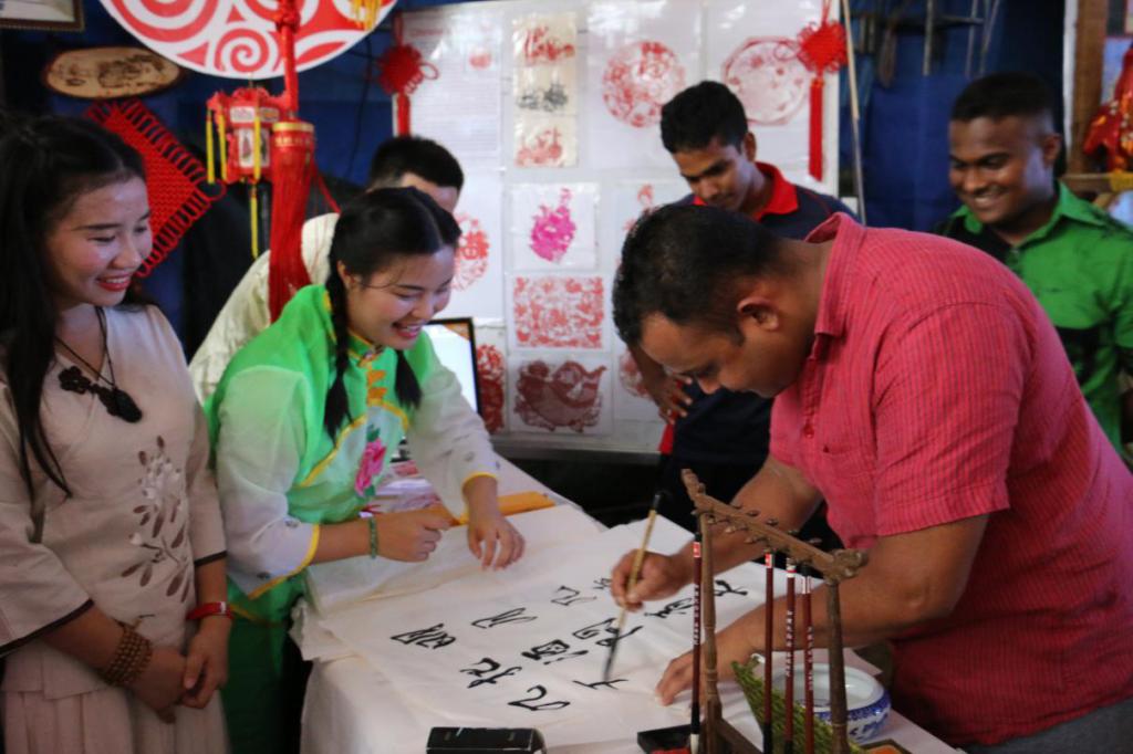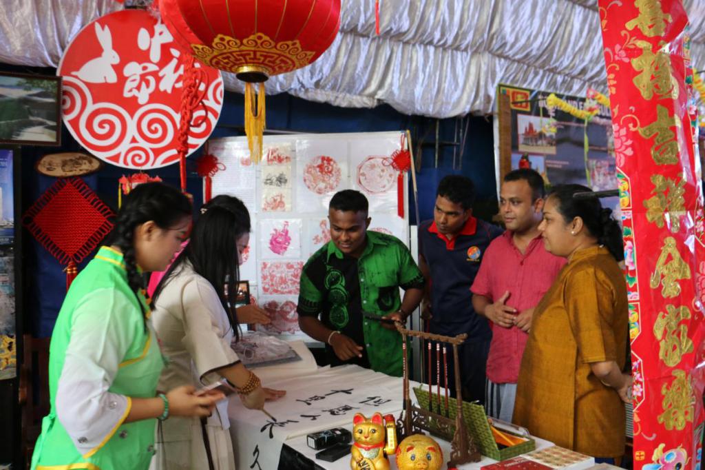 多姿多彩的活动吸引了军校军官和斯里兰卡居民的驻足、询问和了解。中国食物同样大获好评,中国月饼、饺子、瓜子等食物让参观者大呼“amazing”。中国展区的快板、九连环、风筝、葫芦丝也引发了众多兰卡小朋友的好奇心,志愿者们也热情地邀请他们前来感受、尝试。身着中国传统服装的汉语志愿者们也是一道靓丽的风景线,被参观者邀请合影留念。