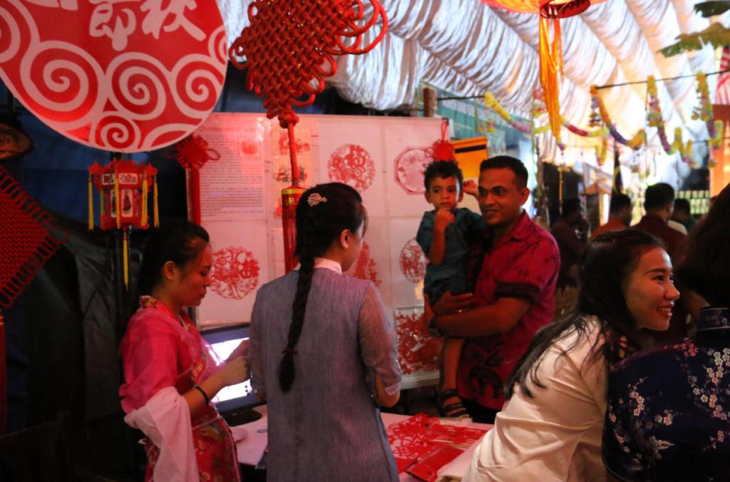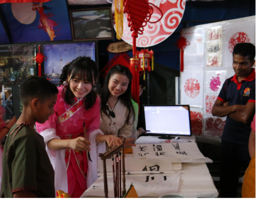 在参加此次活动的东南亚各国里,中国展区别具一格。中国展区此次活动的主题是“恭贺中秋”,鲜红的对联、喜庆的灯笼、美丽的中国结……都营造出一股浓浓的节日氛围。志愿者教师以此为主题分别展示了中国剪纸、中国结、书法和京剧脸谱绘制等。