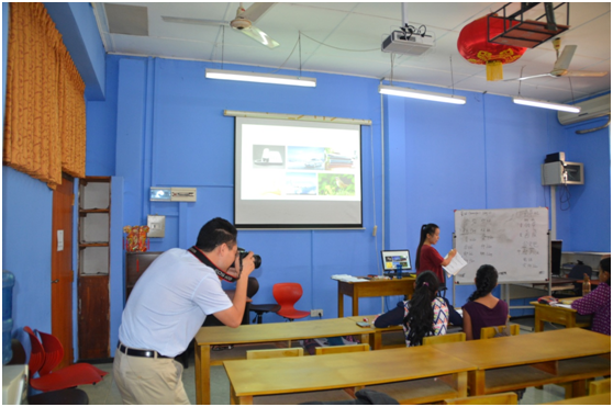随后,苑基荣记者走进孔子学院课堂,观摩了课堂教学。课后,苑基荣记者采访了部分凯大中文系学生,进一步了解了斯里兰卡社会、经济、文化、教育等方面的情况。同时,还采访了孔子学院中外方汉语教师,了解本土汉语师资的现状,还对中国的公派汉语教师以及志愿者教师的工作及生活进行面对面访谈。