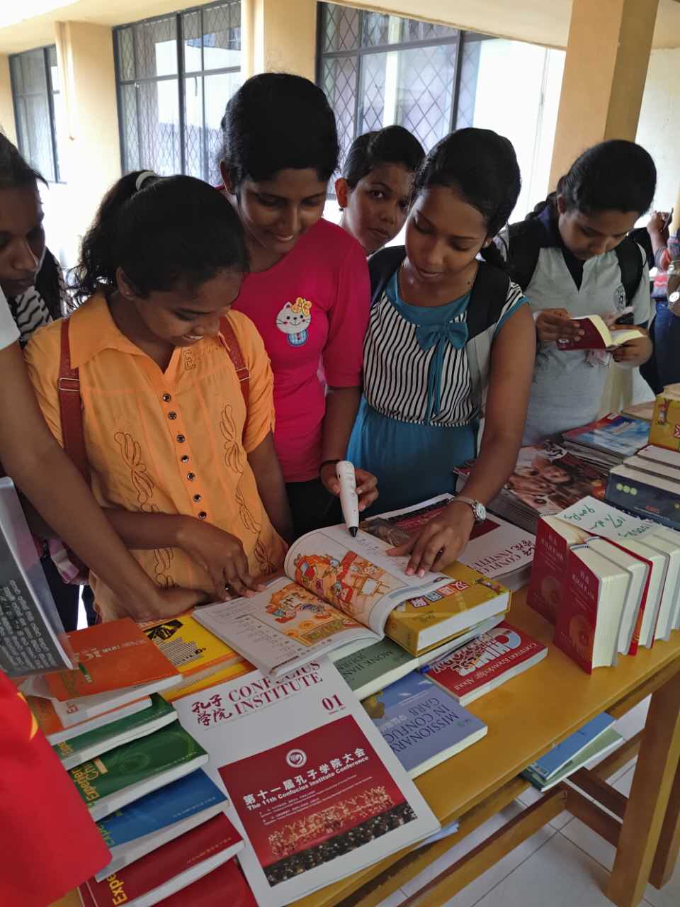 本次书展展出的书籍共分教材、文化、词典以及艺术四大类。其中汉语教材《快乐汉语》、《新实用汉语》、《跟我学汉语》、《当代中文》(僧伽罗语版),工具书《英汉汉英词典》、《汉语图解小词典》等备受欢迎。而介绍中国文化以及有关中国历史、地理的书籍也吸引了学生们的关注,大家纷纷翻阅、咨询、购买。孔子学院中方院长黄洁教授、外方院长达默迪纳法师、凯大中国文化中心柯玛丽博士也来到书展现场,用汉语、僧伽罗语向学生们介绍部分图书和教材。