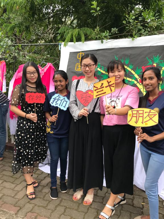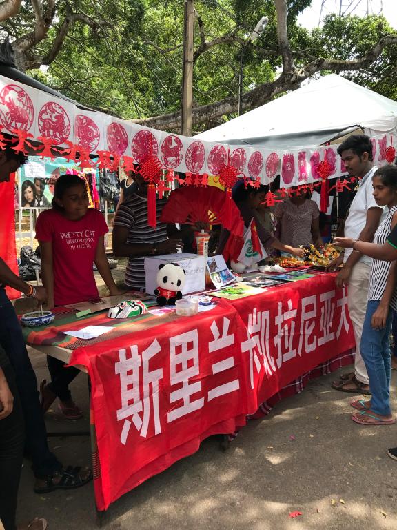 文化展位区布满学校主干道两侧,各有特色。经济管理学院展台绘制传统印度手绘Mehendi,学生亲手制作了宣传贴画和Instagram相框、吸引着同学驻足合影拍照;计算机与技术学院展台为在校师生义务维修电脑;社会科学学院展台制作了斯里兰卡传统小吃,邀请全校师生品尝。人文学院作为凯拉尼亚大学主要学院,各专业在文化展上也各显所长。美术专业的油画作品一字排开令人赞叹;现代语言系各语种专业,汉语、韩语、日语、巴利语专业呈现了异国风情,其中汉语专业最亮眼。
