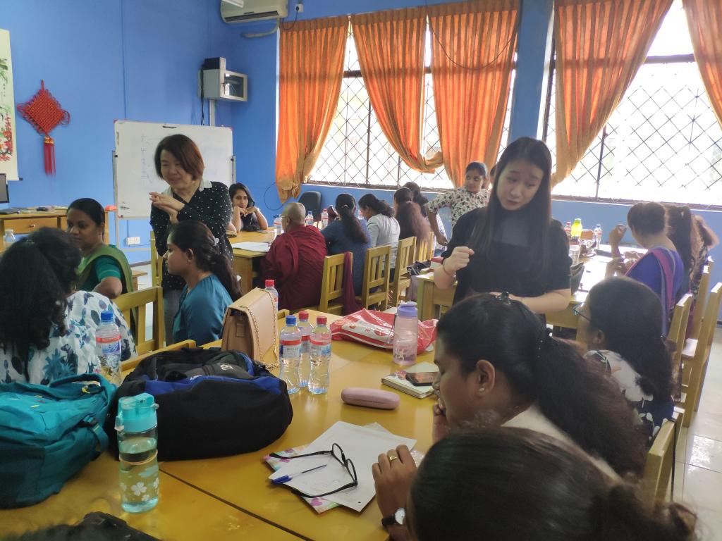 针对斯里兰卡本土教师在声调教学所遇到的问题,唐英老师做了一场汉语声调教学的专题讲座。在小组讨论环节,李晶晶老师结合自身教学经验针对老师们在实际教学中遇到的问题给出了教学建议并分享了一些简单易行的教学方法。