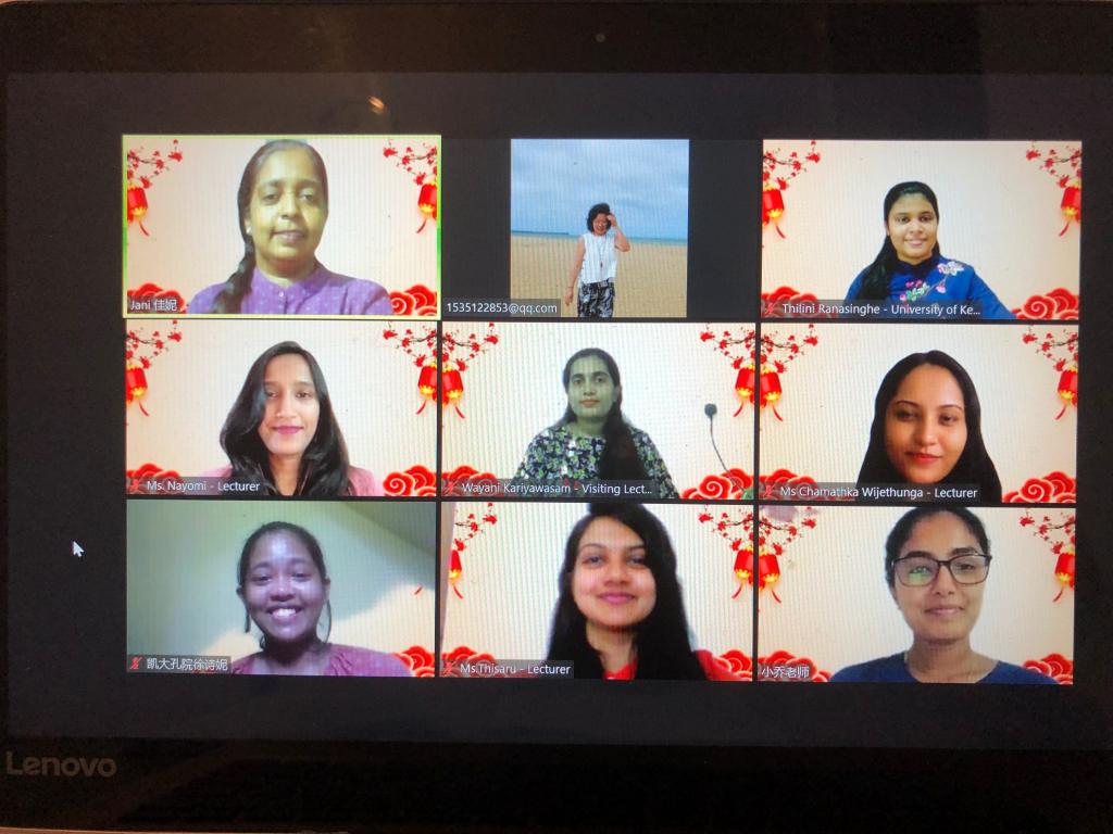 本次活动,因受疫情影响,只能通过线上举行,但参与人数仍高达240余人,主要邀请凯拉尼亚大学(以下简称“凯大”)非汉语专业汉语选修课的学生及汉语专业学生参加。出席会议嘉宾众多。他们是凯拉尼亚大学人文学院Sudath Senarath院长,现代语言系系主任Dilrukshi Rathnayake博士,以及现代语言系中文专业的全体老师和孔院的全体老师们。