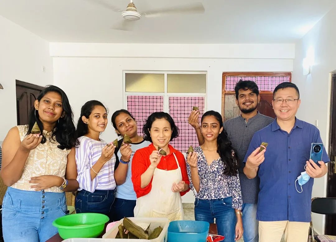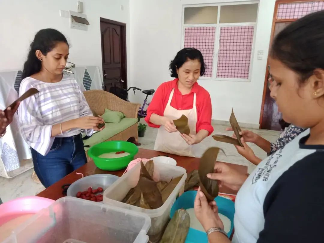 本次学习包粽子活动采取线上线下结合的方式进行。下午三点,线下活动在旅居斯里兰卡的华人杨玉红女士家的客厅开始。杨玉红女士首先简单介绍了粽子的种类、食材特点和相关食材的准备方法,便开始手把手的教同学们包粽子。