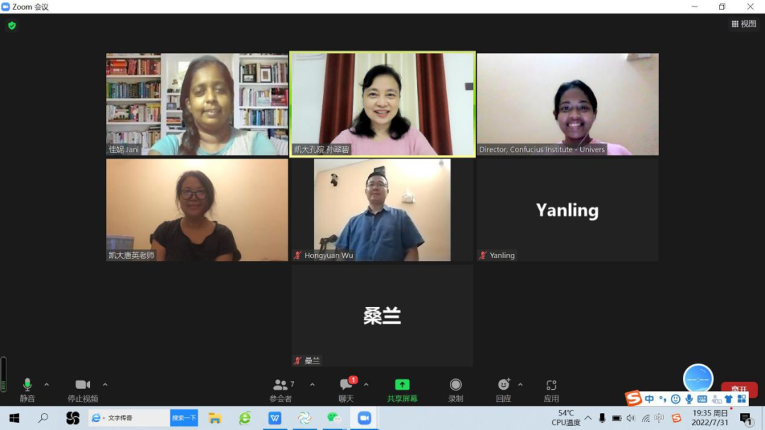 2022年7月31日晚上,凯拉尼亚大学孔子学院在线上召开了2022-2023新学年工作会议。凯拉尼亚大学孔子学院中方院长吴洪远博士、外方院长佳妮博士、中外方教师孙翠碧、唐英、桑兰、何艳玲以及学院办公室秘书徐诗妮出席了会议。