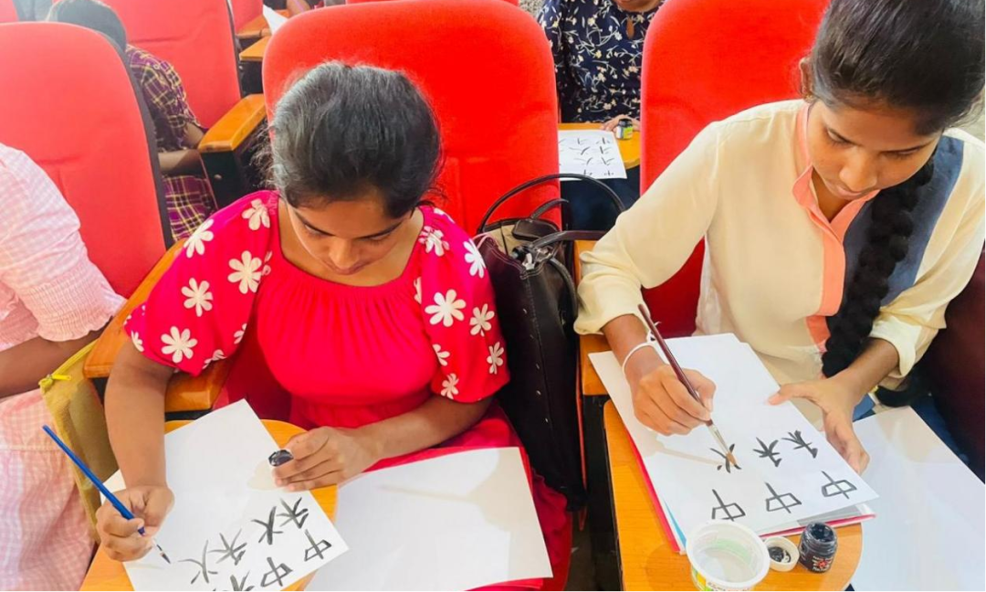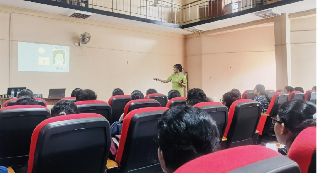 本次宣讲活动包含中文拼音讲解、中国传统节日——中秋节介绍、书法及剪纸艺术等内容。宣讲活动的第一个项目是由刘艺涵老师对中文拼音的详细介绍,结合斯里兰卡学生的发音特点着重训练送气音与不送气音的区别。