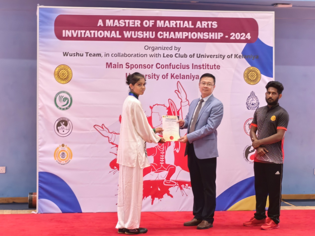 比赛结束后,武术队教练Bodinagoda老师、体育系系主任G G U Saman Kumara教授、凯拉尼亚孔子学院中斯方院长吴洪远博士、佳妮博士和科学学院院长Sudath RD Kalingamudali教授分别向获奖队员颁发奖牌和奖状。