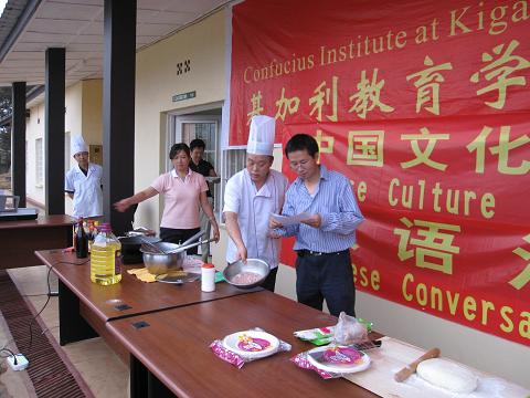 首先,基加利教育学院孔子学院外方院长YANZIGIYE Beatrice博士为启动仪式致辞。这次活动以中餐为主题向到场观众展示中国饮食文化,同时还准备了中国电影,乒乓球等活动。应孔子学院邀请,中国驻卢旺达大使馆临时代办李意钢安排了使馆的中国厨师到孔子学院演示中国菜的做法。侯万春院长介绍了中餐的特点、技巧和制作过程,并现场教授大家如何使用了筷子,在厨师做“五柳鱼”和“宫保鸡丁”的时候,讲解了这两道菜的故事来源,让观众们享受了双重盛宴。在基加利教育学院学生音乐俱乐部弹奏的《茉莉花》、《甜蜜蜜》等中国歌曲的背景下,厨师演示了如何包饺子后,请现场观众亲身体验了包饺子的全过程,侯院长也为大家做了丰盛的家常菜。一切就绪后,所有人都兴致勃勃地拿着还不太熟练的筷子一边品尝着中国美食,一边欣赏着中国电影《功夫厨神》,得到了视觉味觉上的双重享受。之后,有些人在我们临时构筑的乒乓球台上大显身手。