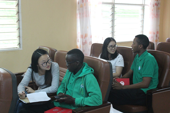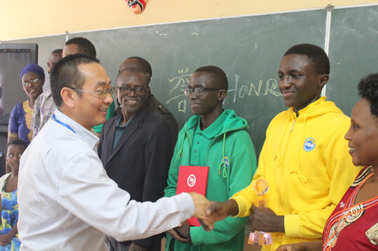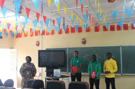 从机场离开后,队员们与家长来到孔院本部,受到了外方院长及孔院教师和学生代表们的热烈欢迎。队员们生动热情地分享了他们在中国参加比赛时的见闻和感受,获得了大家的阵阵掌声。交流过后,张院长作了总结。他讲到,这次汉语桥比赛的历史性成功,既是对队员们努力拼搏的鼓励,更是对孔院全体教师们一直以来辛勤付出、无私奉献的最好回馈。这是队员们的成绩,是老师们的骄傲,是卢旺达孔院的荣耀。他鼓励在场的学生们要向参赛队员们学习,迎接挑战,把握机会。同时,张院长也勉励各位汉语教师再接再厉,更加积极地投入工作,为实现卢旺达孔院的“三化”目标而努力。