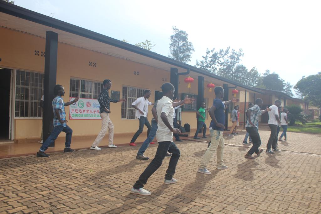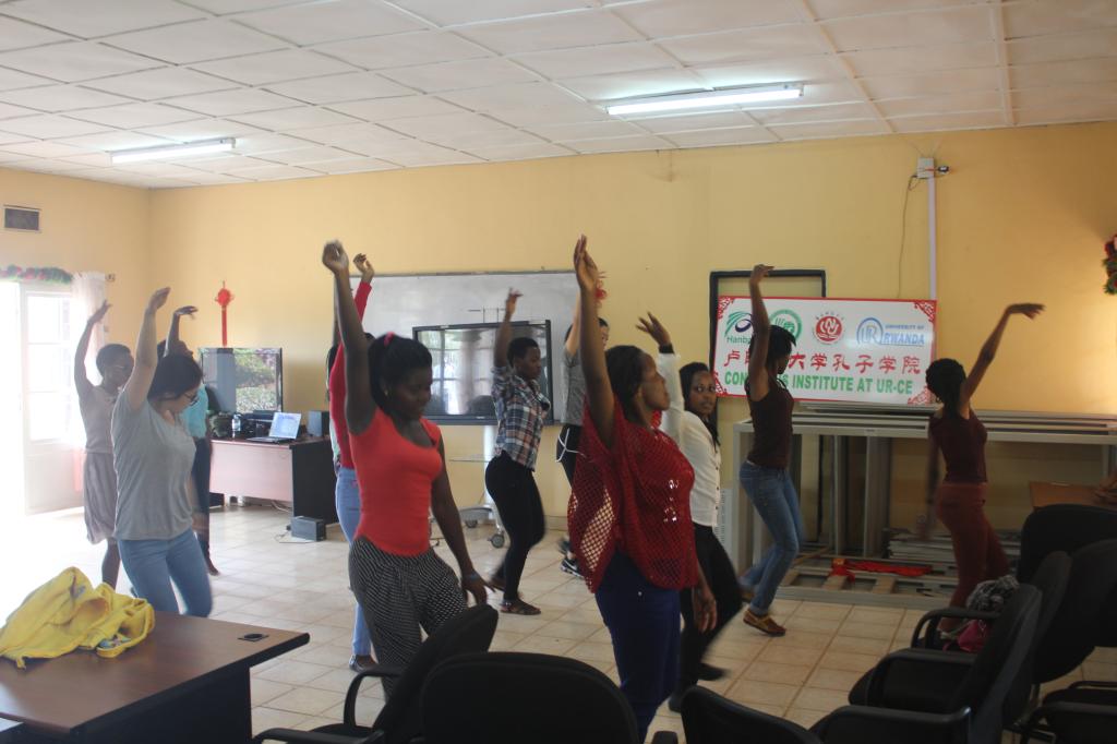 虽然已经是周末,但艺术团的老师们依然热情高涨地开展文化教学,和学生们一起沉醉在中华文化的迷人的魅力中。教室里,广场上,到处都活跃着师生们的身影:练太极,手眼身法步,意力精气神,在刚柔并济的动作中,学生们体会到太极拳“任他千钧来打我,牵动四两拨千斤”的美妙,感受着中华文化独到的魅力与意境;唱歌曲,同声共气,激情飞扬,或低回婉转,或激亢高昂,千回百转的曲调里,唱出的是学生们对中国文化的热情向往;学舞蹈,时而蹁跹欲飞,时而漫步轻裳,与辗转灵动的舞姿相伴的,是学生们陶醉而喜悦的笑容。无论是是教师还是学生,都在挥洒着汗水,挥舞着青春,谱就着卢旺达大地上汉推事业的动人篇章。