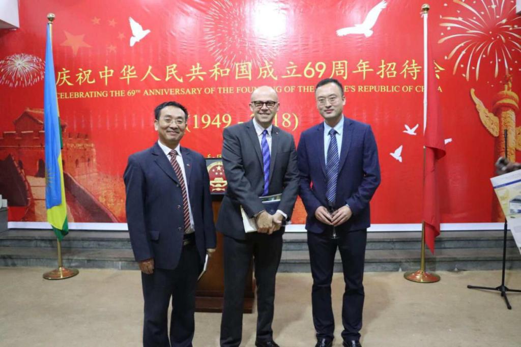 招待会上,中国驻卢旺达大使饶宏伟先生首先讲话。饶大使表示,中卢两国关系近年来取得重大发展。特别是2018年,习近平总书记访问卢旺达,卢旺达总统卡加梅访问中国,为中卢两国达成众多实质性合作,中卢两国经济文化交流迈上新台阶。 随后,卢方政府代表讲话,他肯定了中卢两国日益密切的关系,并对中国成立69周年表示祝贺,也祝愿中华人民共和国越来越好。
