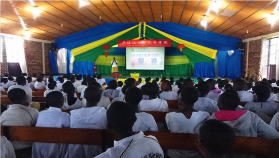 当地时间5月19日下午,卢旺达大学教育学院孔子学院下设E.N.D.P.K教学点首届中学生“汉语之星”暨“汉语桥”复赛,在学校礼堂成功举办,为期两个月的赛事活动圆满落幕。教学点全校全体学生600余人参加了此次文化活动。校长费勒名那·尼拉胡库(Sister Philomene Nyirahuku)、学校新闻负责教师尼达亚巴杰·维尼芮(Ndayambaje Valery)应邀也参加了此次活动,并与三名来自高三的学生一起,共同担任了本次比赛的评委。
