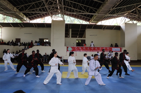 卢旺达大学孔子学院师生代表在开幕式中,以行云流水、刚柔并济的太极拳方阵表演,全面表达了武术源于中国、服务卢旺达、属于世界的主题。