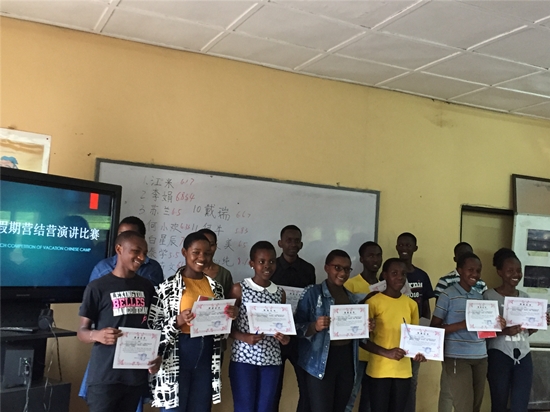本次结营由笔试和演讲比赛两种形式组成。笔试检测了学生的语言学习成果,其中,来自法维女子学校的李娟同学(MAHORO ANNIE PROMESSE)以95分的成绩荣获第一名。演讲比赛中,学生根据在假期营中对中国文化的了解,各抒己见,对比了两国各个方面文化的异同。来自布塔雷国立中学的刘心纯(GAJU ELISSA)表现突出,荣获第一名。除笔试及演讲前三名奖项以外,本次假期营另设表现突出奖、最佳出勤奖、学习勤奋奖。