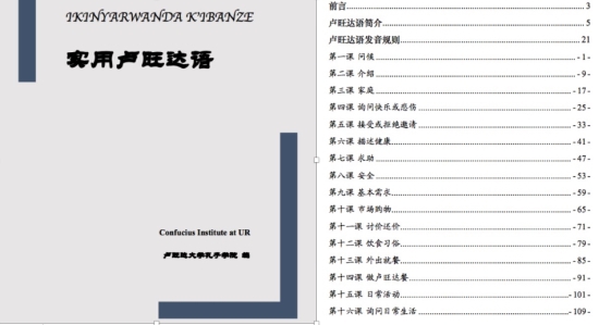 在配合卢旺达政府全民居家隔离的防控措施下,为缓解因疫情而被迫“禁足”的焦虑与不适,卢大孔院组织八位老师编写了《实用卢旺达语》教材。目前,该书已完成第三稿校对工作,正在进行最后一轮校对。全书共240页,近20万字,编写卢旺达语课程24课,收录卢旺达语生词1000余条。