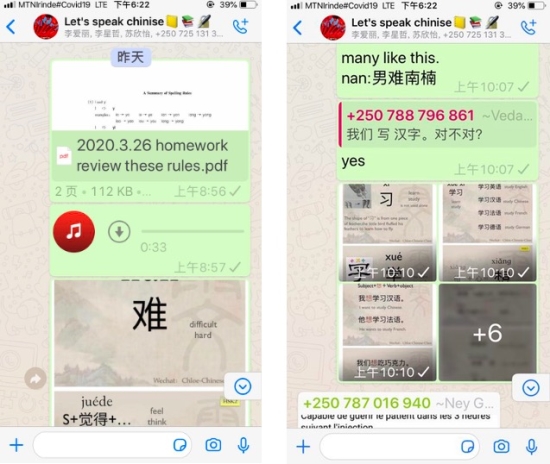 停课期间,限于网速和学生资源不足等条件,老师们无法通过视频、直播等方式实现线上教学。因此,卢大孔院的汉语教师们因地制宜,利用各班早已建好的What’app学习群进行在线教学。老师们通过各自班级的汉语学习群,发布课件、讲解课程、语音答疑、布置作业并批改反馈,同学们开始虽有点儿不习惯,但很快便能适应这种方式。