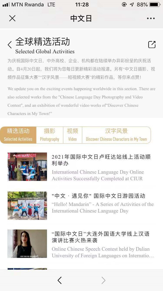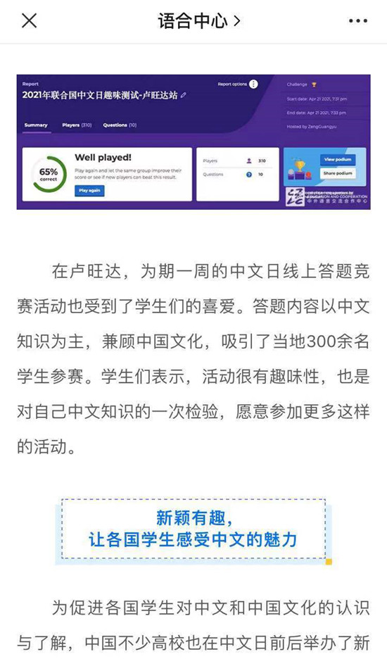 中文日“全球精彩活动”中,卢大孔院举行了为期一周的中文日线上答题竞赛活动。答题内容以中文知识为主,兼顾中国文化和卢旺达国际中文教育具体情况,吸引了全球300余名中文爱好者参赛。