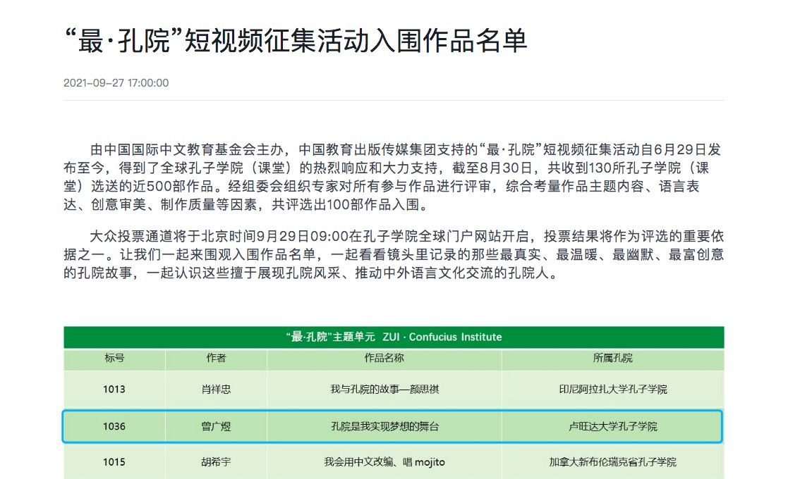 9月29日,由中国国际中文教育基金会主办,中国教育出版传媒集团支持的“最·孔院”短视频百部入围作品名单揭晓,卢旺达大学孔子学院提交的短视频“孔院是我实现梦想的舞台”入围“最·孔院”单元作品。