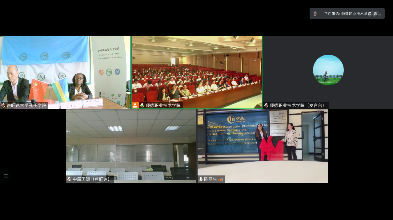 5月5日,卢旺达大学孔子学院与中国广东顺德职业技术学院以及中辰科建集团有限公司三方合作培养“中文+职业技能”人才项目签约仪式通过线上线下方式融合举行。顺德职业技术学院校长夏伟和该校100余名师生、中辰科建集团有限公司董事长龚武、卢旺达大学孔子学院外方院长毕翠丝(Beatrice Yanzigiye)和中方院长曾广煜、中辰科建(广东)集团有限公司东非总裁陈丽生、大自然化工科技有限公司(卢旺达)总经理王雪竹以及中辰科建集团卢旺达分公司20余名当地员工参加。