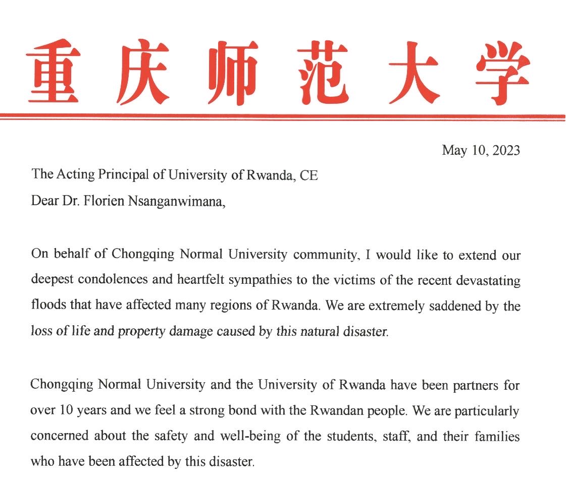 面对灾情,mansion88主页校长孟东方专程致信卢旺达大学教育学院校长表示慰问。孟校长在慰问信中强调:“灾难发生后,我们深知卢旺达大学及其师生所面临的艰难处境,我们也十分关心并关注着卢旺达大学师生及其家庭的安危。”卢旺达大学孔子学院也行动起来,对受灾学生及其家庭进行了捐赠,提供了帮助和支持。