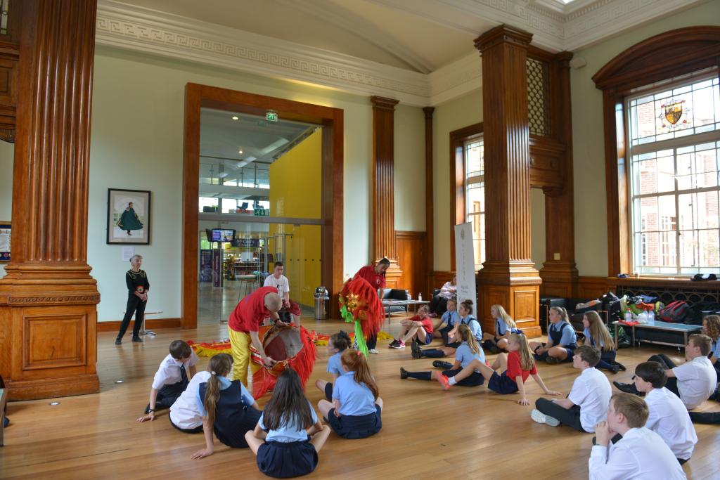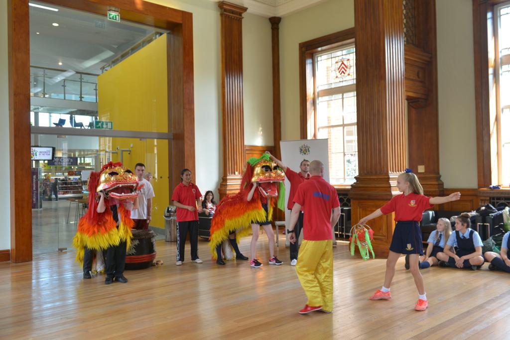与孔子学院以往文化活动观看舞狮表演不同的是,此次庆祝活动特别聘请了当地武术中心的专业舞狮队为前来参加庆祝活动的50名中学生特别设计了一个半小时的“学舞狮”课程。专业舞狮队的大师首先介绍了中国舞狮的风俗及传统,然后将学生们分成两人一小组,学习舞狮的基本步伐,学生们兴趣盎然,认真练习。最后,学生们带上狮头,穿上狮身,进行了一场真正的舞狮表演,赢得了在场观众的热烈喝彩。