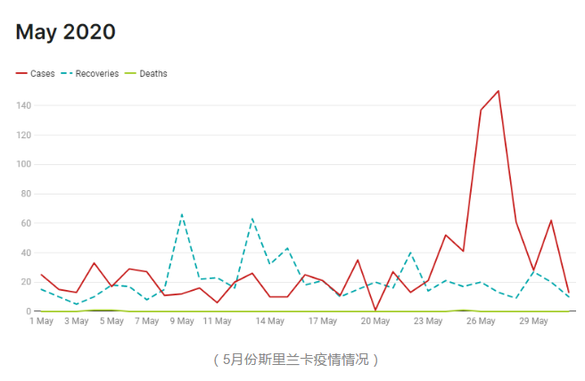 5月份同时报告了疫情爆发以来单日新增最多一天:5月27日共报告150例,而5月26日报告了137例。5月28日,科伦坡市中心的Gafoor大楼的海军确诊,200多名士兵被隔离。自4月下旬开始在海军蔓延的疫情,5月份仍然活跃。截止到5月,斯里兰卡共有1633人感染新冠,10人死亡。