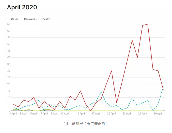 4月的第一天,斯里兰卡出现第3例死亡病例。一位来自科伦坡马拉达纳地区的72岁老人在传染病医院抢救无效死亡。当月斯里兰卡共报告4例死亡病例,使四月成为死亡人数最多的月份。同时,出现几个社区感染集群,并造成海军基地士兵感染。海军是集体住宿,非常容易传染。病毒开始在海军军营内传播。直到今天仍有海军感染病例报告,成为斯里兰卡感染最严重的感染集群。整个四月,科伦坡等地的居民是在宵禁中度过的。“禁足”期间,网上购物、送菜送货上门逐渐成为常态。而严格的宵禁规定,也让斯里兰卡在4月底控制住了疫情在社区的扩散。